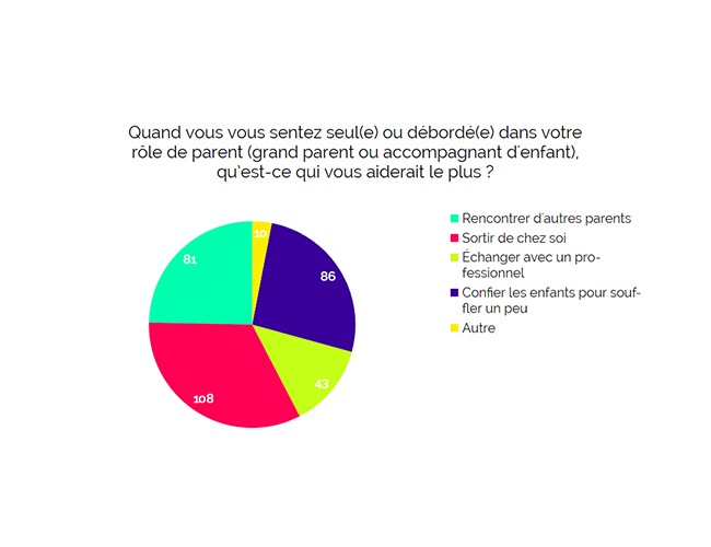 Lorsque l’enquête interroge les répondants sur ce qui aiderait le plus les parents lorsqu’ils se sentent débordés, les priorités sont » Confier occasionnellement les enfants pour « souffler » », « Rencontrer d’autres parents », « Sortir de chez soi »