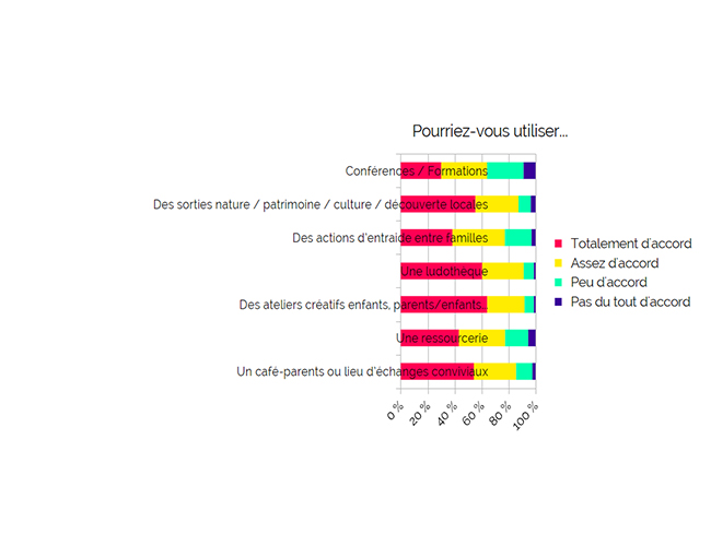 Concernant les propositions les plus souhaitées, dans l’ordre : un café des parents, une ludothèque et des ateliers créatifs apparaissent très majoritairement.