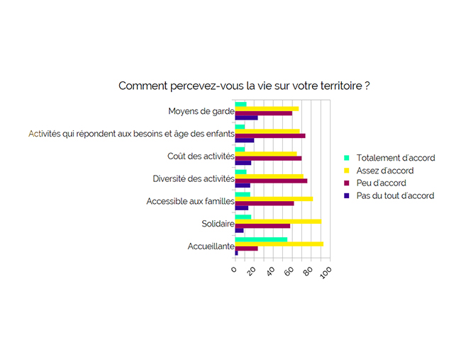 Les items relatifs à la perception de la vie sur le territoire soulignent des atouts (cadre agréable, qualité de vie, nature) mais aussi des limites : coût des activités, manque de diversité de l’offre, difficulté à trouver des activités accessibles aux jeunes enfants selon les horaires familiaux.